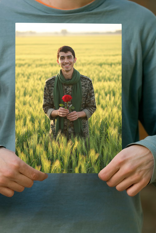 پوستر شهید عباس دانشگر در میان گندم زار با شاخه گل