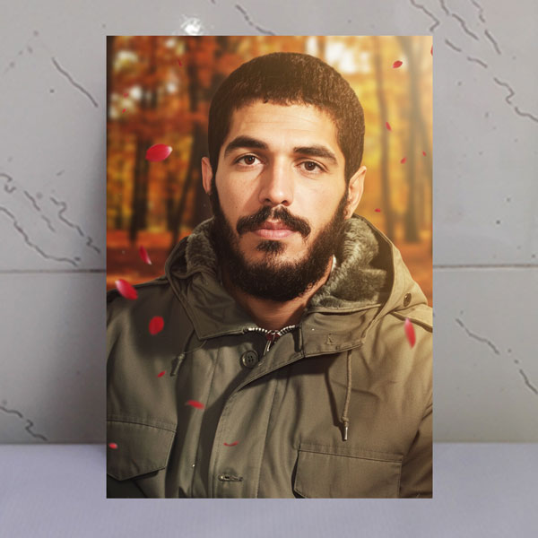 قاب شاسی شهید ابراهیم هادی با زمینه جنگل