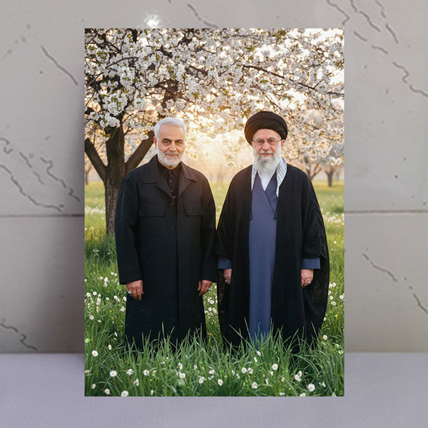 قاب شاسی شهید حاج قاسم و رهبری با زمینه طبیعت