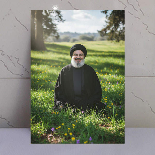 ☑️ خرید قاب شاسی شهید سید حسن نصرالله در میان دشت و درخت - شهدا مارکت