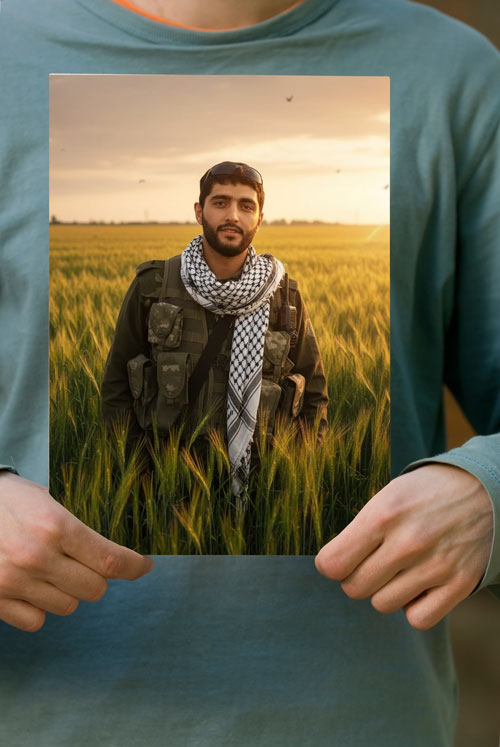 پوستر شهید محمودرضا بیضایی در میان گندم زار